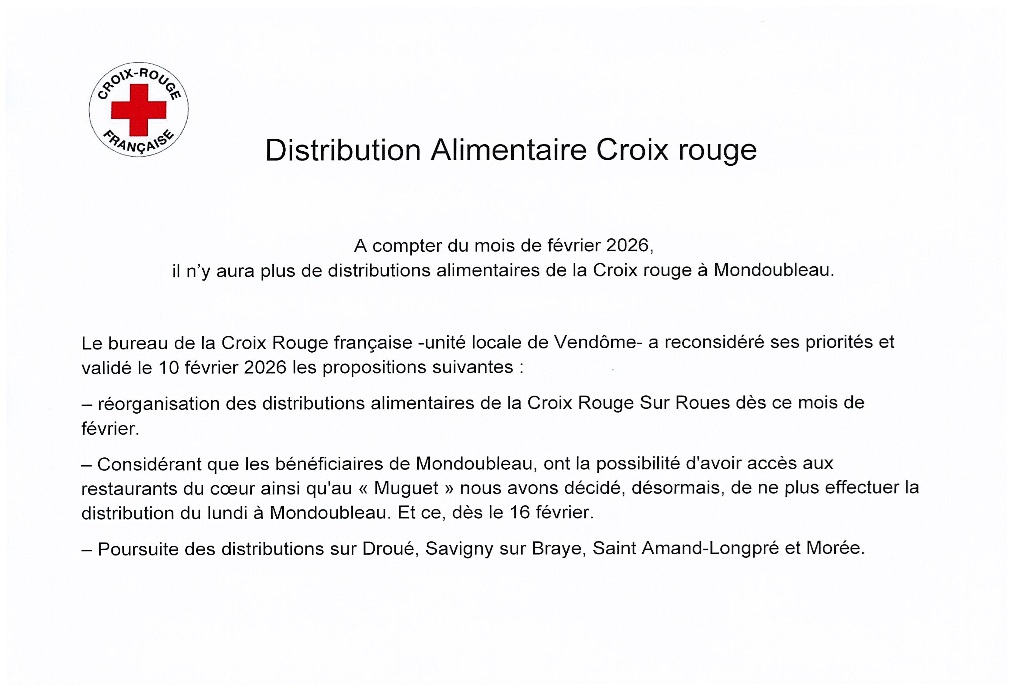 – Considérant que les bénéficiaires de Mondoubleau, ont la possibilité d'avoir accès aux restaurants du cœur ainsi qu'au « Muguet » nous avons décidé, désormais, de ne plus effectuer la distribution du lundi à Mondoubleau. Et ce, dès le 16 février.